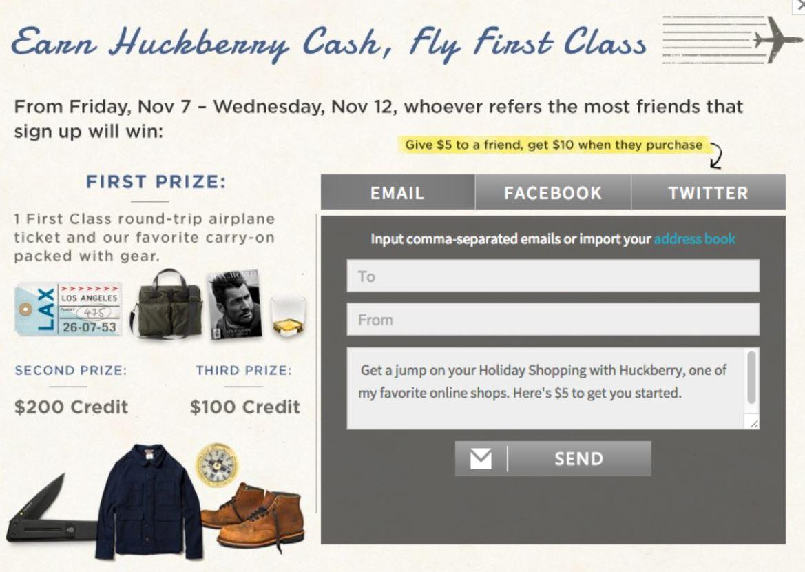 Online retailer Huckberry’s contest encouraged participants to refer their brand in exchange for a $10 credit when they purchase. To bolster motivation, they also offered round-trip plane tickets and carry-on with packed gear to first prize winners.