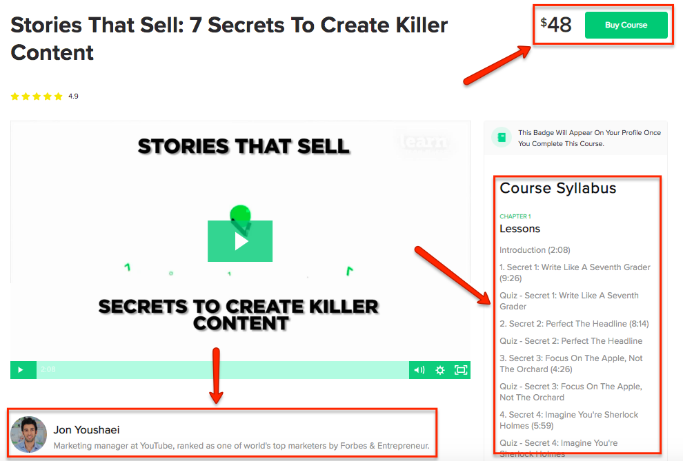 Fiverr, for example, has a section dedicated to freelancer education with all types of training courses, ranging from storytelling to technical SEO audits. Here’s an example course from Jon Youshaei about, “Stories That Sell: 7 Secrets To Create Killer Content.”