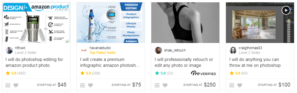 Let's say that you're a designer looking to get your freelance design business off the ground. The first thing you should do is look at others with successful freelance design businesses to gather insights into their competitive offerings. Take, for example, these Fiverr marketplace listing for designers.