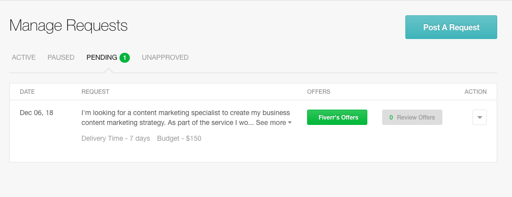 4. You're almost done, just click on the green Post button. Your request will be “pending” until it's reviewed and approved by Fiverr. Once the request is approved, sellers will see it when they look within the Buyers Requests section of the website. They can then respond with offers