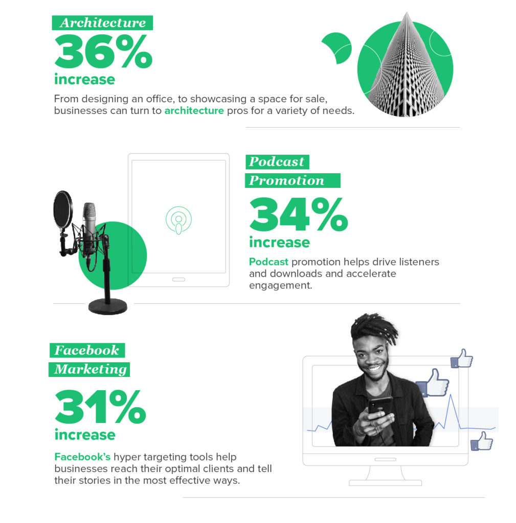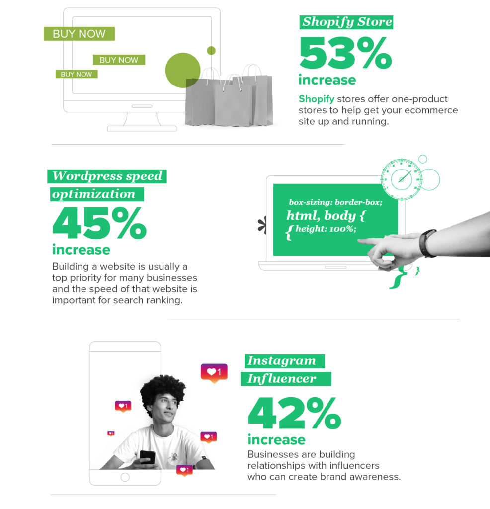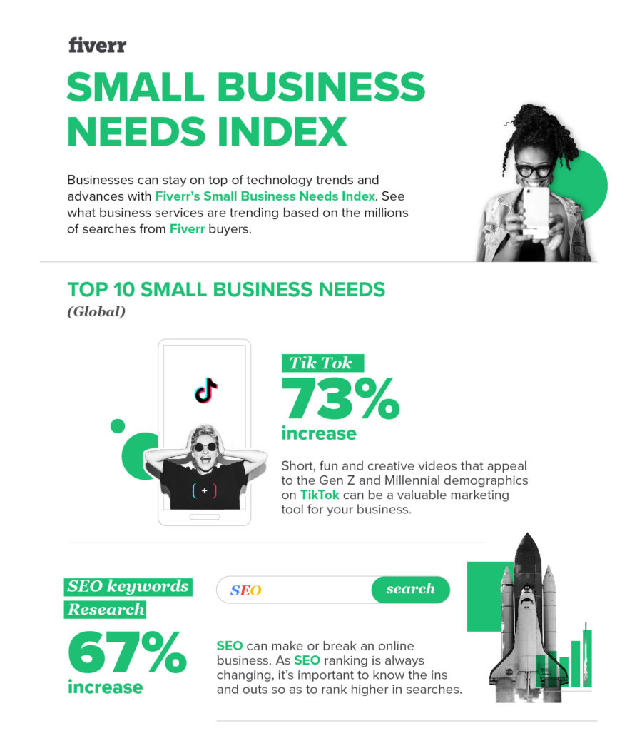 Fiverr’s Small Business Needs Index analyzes data from millions of searches on our platform to identify the largest increases for business services. This growth data therein has the unique ability to predict the products, platforms and tools that small businesses are looking for to help support future success.