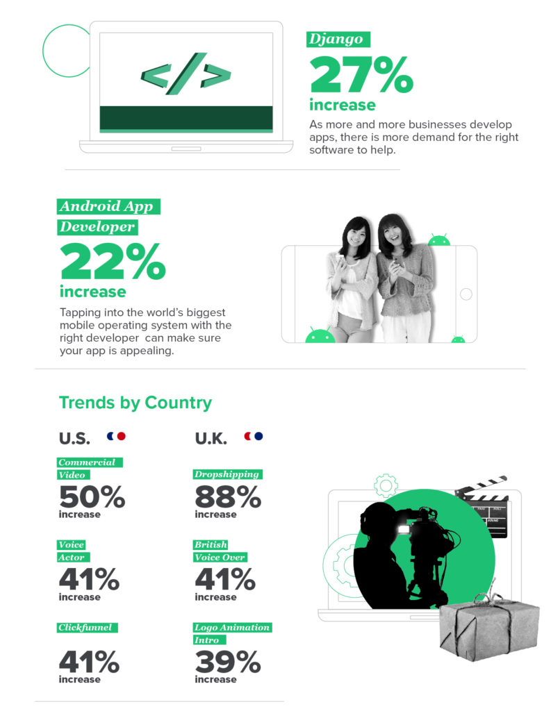 Having an online and mobile presence is now the norm for all businesses, but having a presence isn’t enough. They need to make sure they have the right technology in place to provide the best user experience. A rise in searches for pros to help with Android App Development, Django, and WordPress Speed Optimization makes it clear that strong app and web performance is top of mind for all.