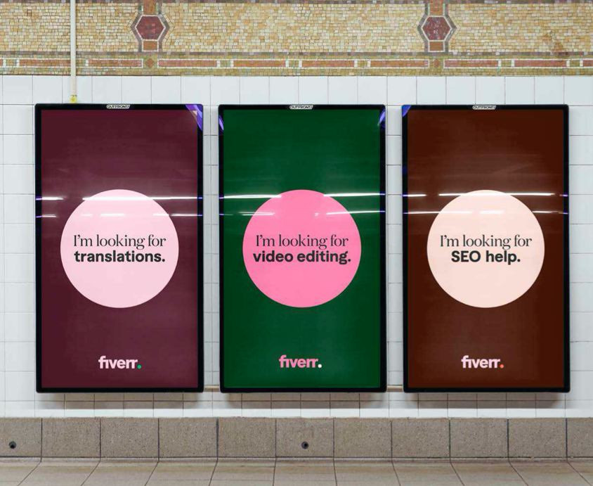 The new Fiverr visual identity will mimic the creativity, energy and determination of the Fiverr community through a bold look and feel: a broadened color palette, a two-typeface typographic system, and a bespoke work marquee.