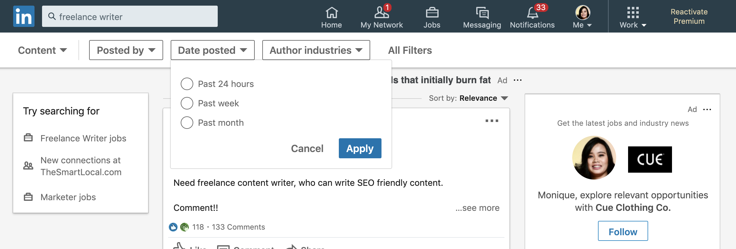 LinkedIn’s job section lets users find freelance writing jobs but you can also find recruiters by reading social media. To get started, go to the content section on LinkedIn and use the search term “freelance writer”. This lets you view freelance writer-centric posts.