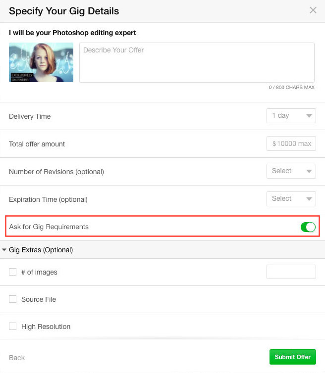So, here’s where the addition comes in. We’ve added in an option to “skip requirements.” When sending an offer to a buyer, sellers can now turn-off the Gig requirements for that offer. Also, when an order is in status “Incomplete” (waiting for the buyer to fill the requirements), sellers can now decide to skip the requirements step and start the order on their own. Ultimately, it removes a step that may hold up the entire process.